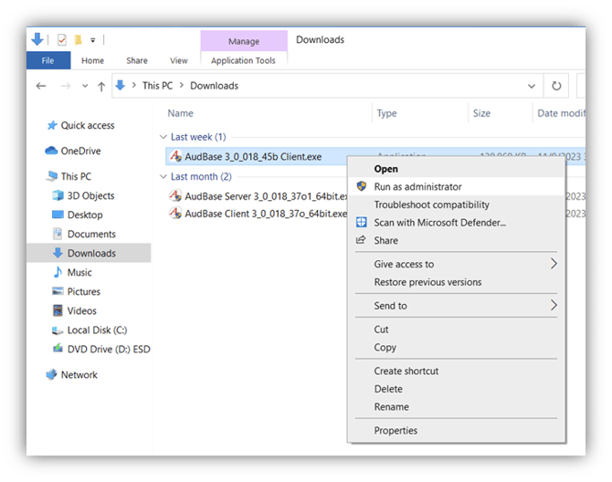 - Navigate to where you’ve placed your AudBase Client installer. Right-click the .exe file and select Run as administrator.