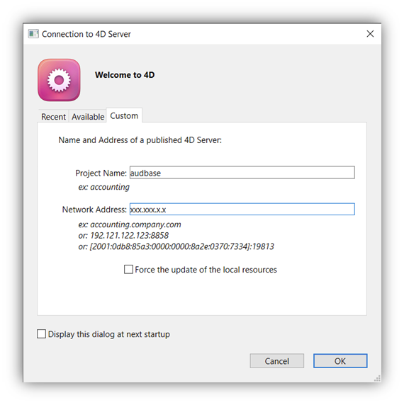 - You will now be taken to a Welcome to 4D screen. Navigate to the custom tab, and enter the following information: