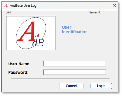Once the client has synchronized with the server, you will then be taken to the AudBase User Login window. Reaching this window is an indication that the Client has successfully connected to the Server. Any subsequent launches of the Client will not require the server information to be entered by the user.